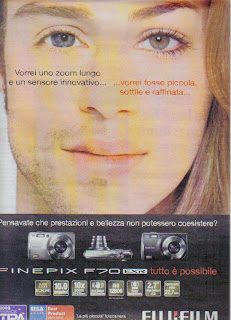 Naturalmente il lato "orizzonti della scienza e della tecnica" appartiene sempre all'uomo. Questa volta però la compatta si è trasformata nelle intenzioni dei pubblicitari in un prolungamento della potenza virile. Ve l'immaginate uno che si vanta dicendo: vieni a casa mia, non faccio per dire ma ho lo zoom lungo e il sensore innovativo? La povera vittima si ritroverà a dire a sua volta, per non sfigurare,